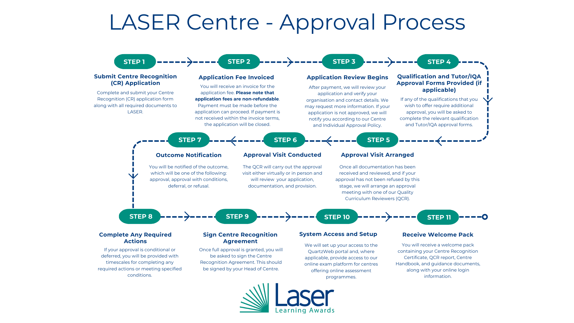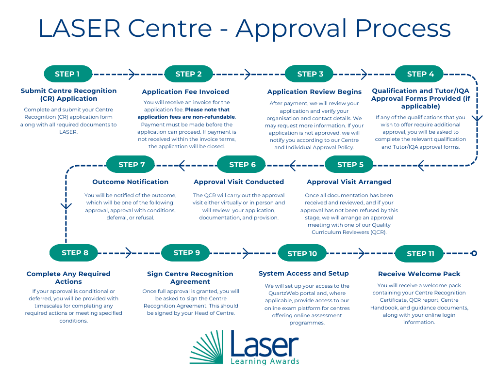 Complete and submit your Centre Recognition (CR) application form along with all required documents to LASER.